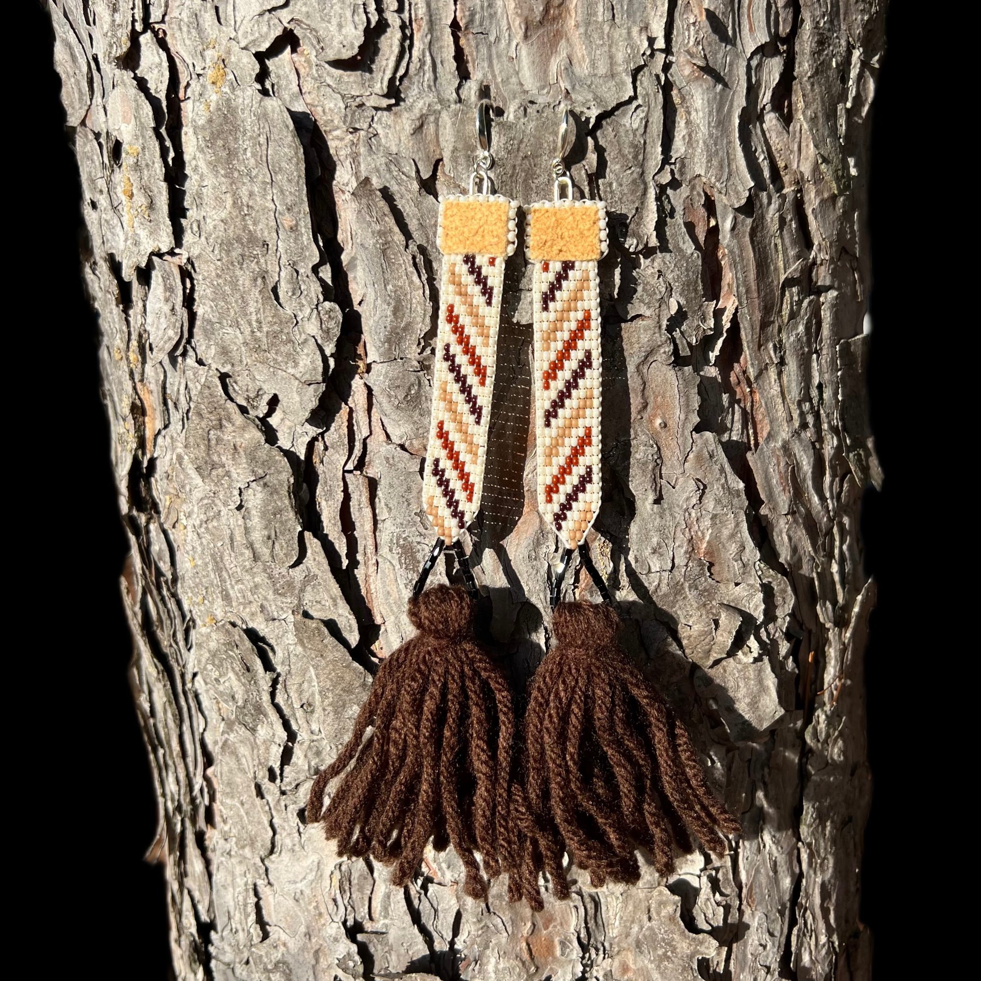 loom woven Czech beads - size 11 smoked deer hide leather sterling silver hardware yarn half poms